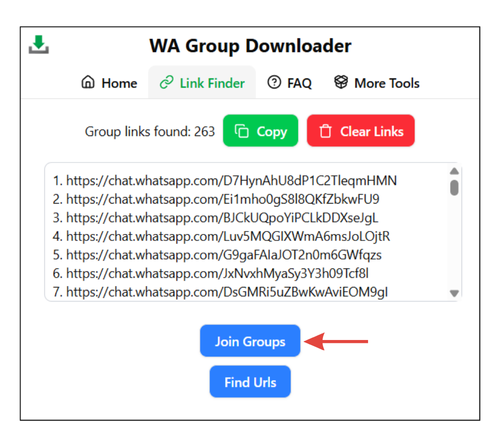 Click the Find URLs button. The tool will automatically detect and extract all WhatsApp group invite links available on the page you are viewing.